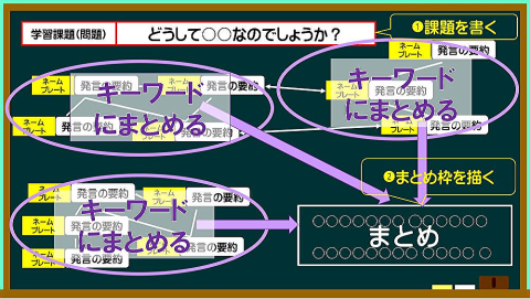 「資質・能力」を育成する「主体的・対話的で深い学び」を実現するには、「板書」も大きな役割を果たします。誰がどんな発言をして、どのように考えてきたのか「話し合いの過程」を分かりやすく表しているものが、役立つ「板書」です。誰がどんな発言をしたのか分かるように「ネームプレート」を活用することは、「話し合いの板書」の基本です。 |