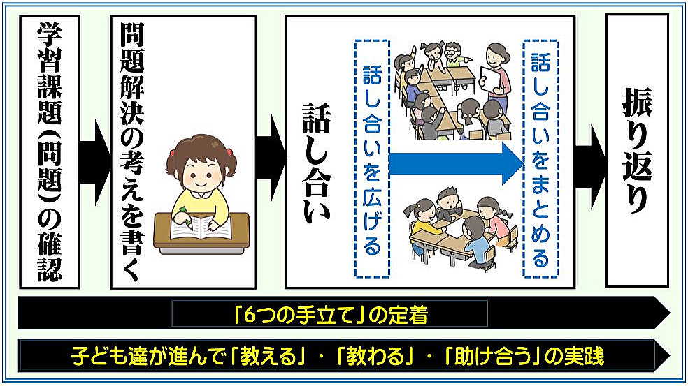 | 学習過程 | ①学習課題(問題)を確認する活動、 ②一人一人が問題解決の考えを書く活動、 ③話し合い(話し合いを広げる段階・話し合いをまとめる段階)、 ④振り返り(話し合い後の自分の考えをまとめる) |