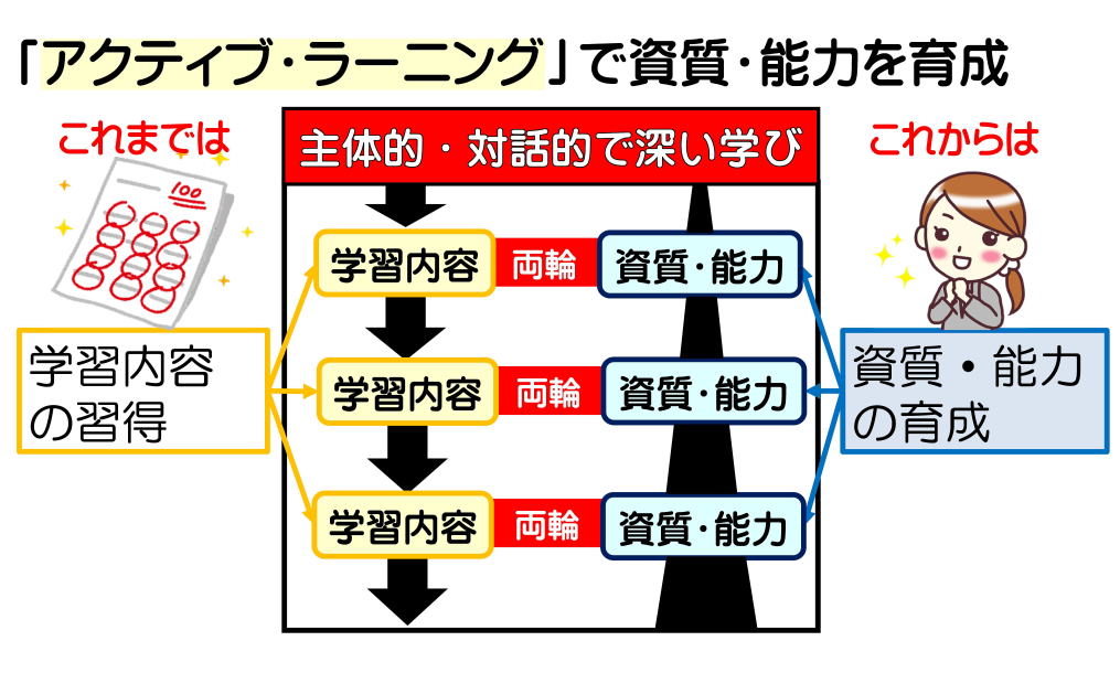 「主体的・対話的で深い学び」の目的は、学習過程において思考力等の「資質・能力」を養うことです。 話し合いで作り上げた「最適解」や「新たな考え」も大切ですが、それ以上に「学習過程」で、どんな「資質・能力」を使って、どれだけ「資質・能力」を育成できたのかが重視されます。 テストで良い点を取れば、学習の目的が達成できたという考え方は、見直す必要があります。 |